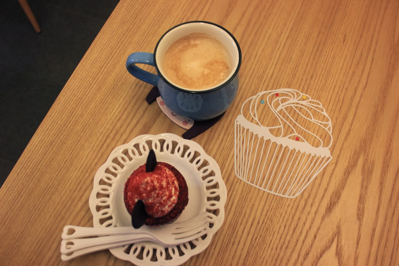 We had a latte and a red velvet cupcake! The red velvet cupcake looks so cute right? [:
